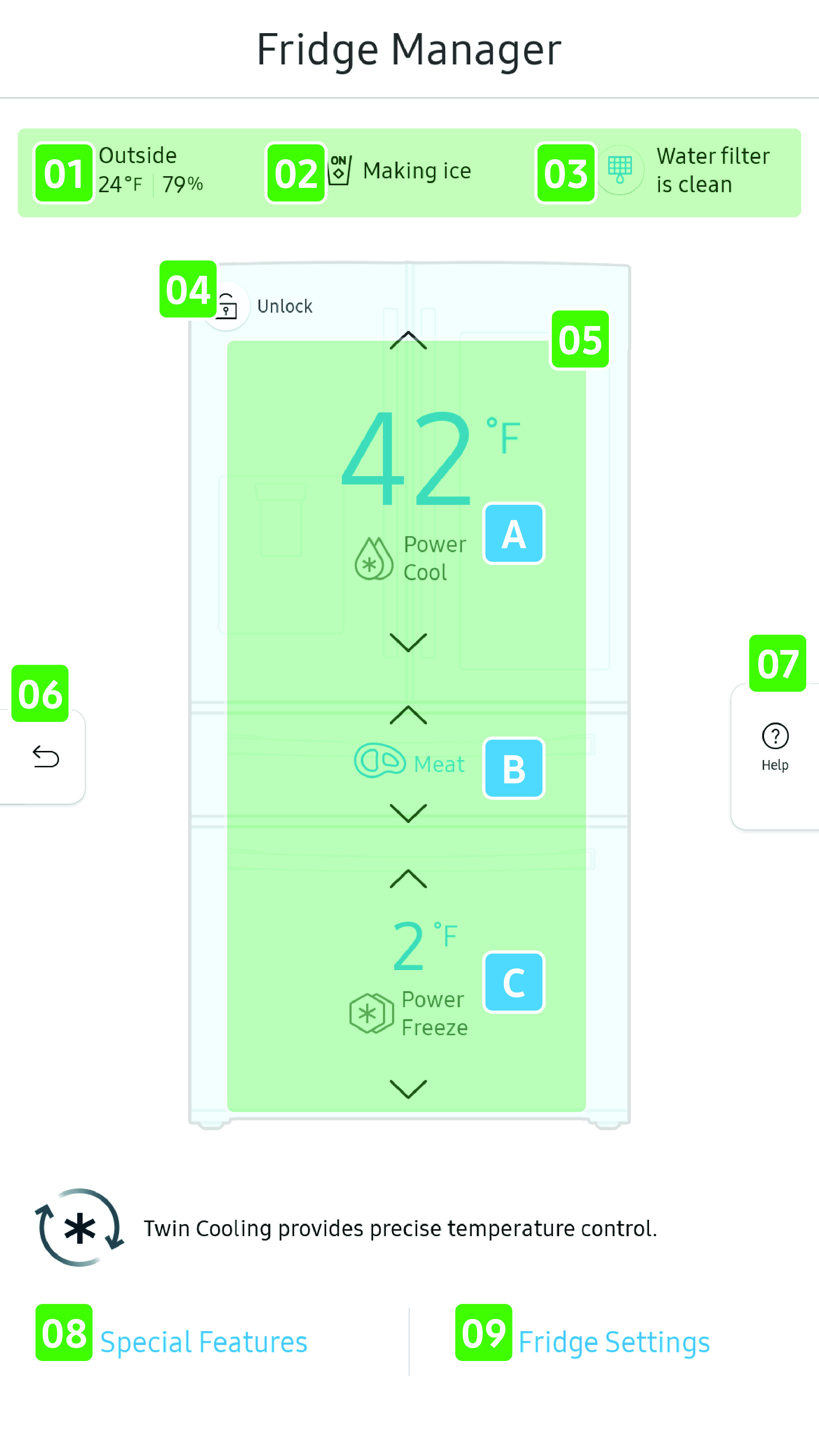 You can also tap the up or down arrow on the Fridge Manager app’s main screen to change the mode in this sequence: Frozen - Soft Freeze - Meat & Fish - Cheese & Vegetables - White wine.